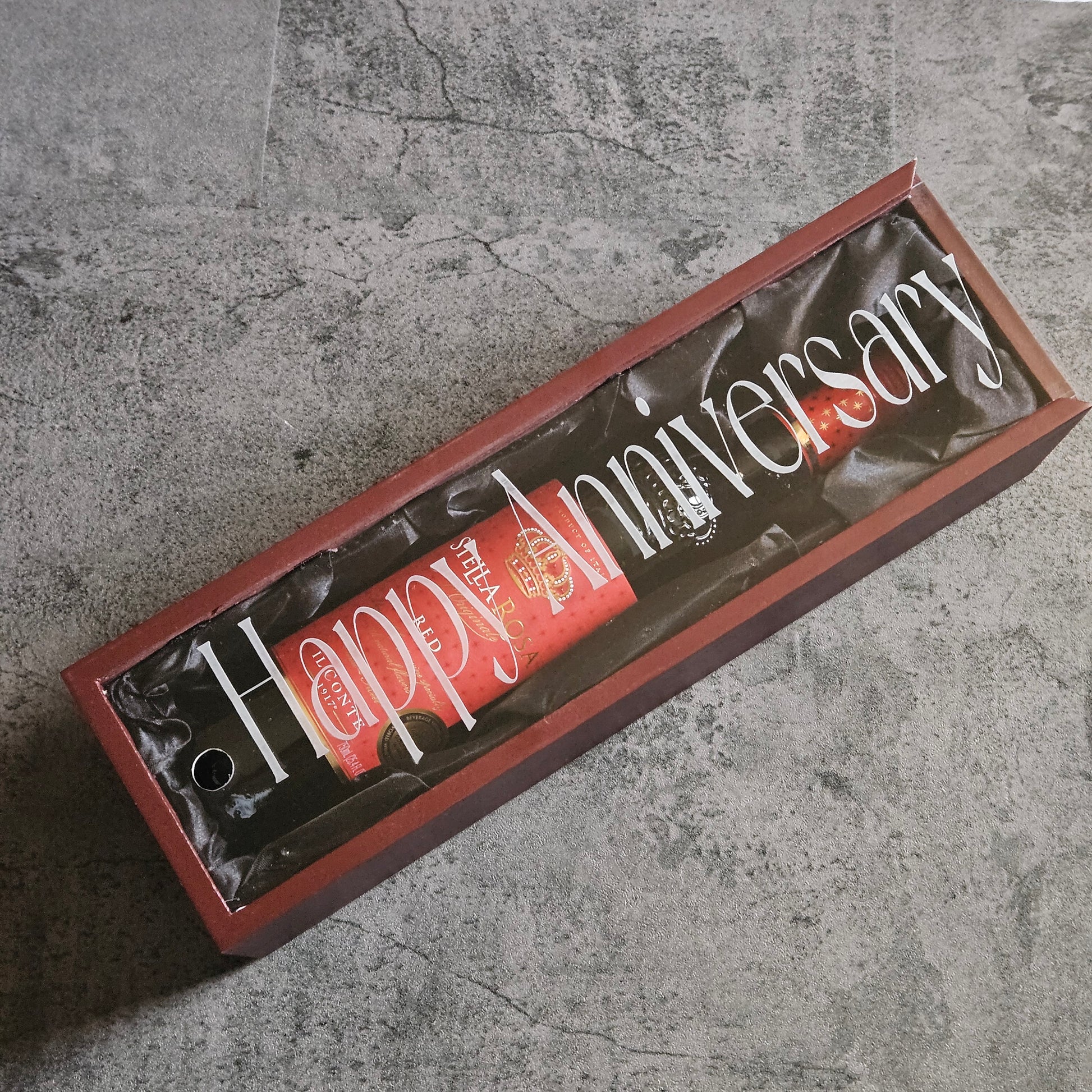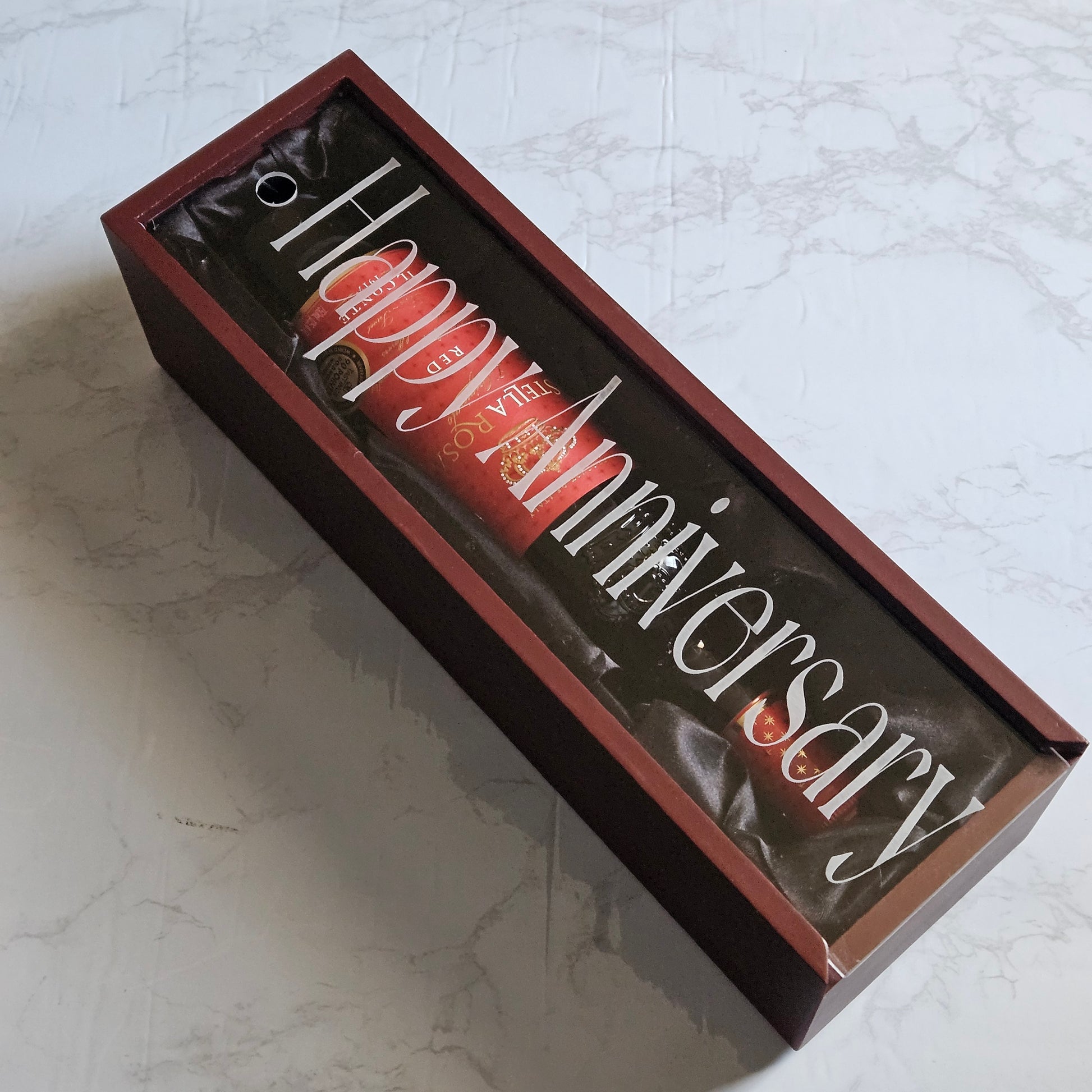 Our engraved wooden wine bottle box is a remarkable way to elevate the look of your liquor bottle gifts. Precision crafted with rosewood finish, a shatterproof acrylic glass lid gently slides across the top, revealing that beautiful bottle. Ideal for retirement parties, weddings, anniversaries, and more. The wooden wine bottle box measures 14.25" x 4.25" x 4", and holds bottles most alcohol bottles up to 13" in size. The actual liquor bottle is not included.